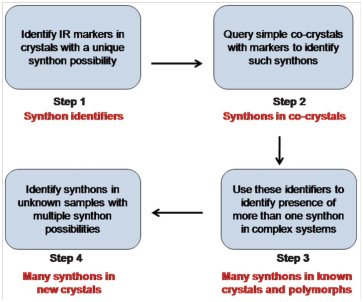 Supramolecular synthons, structural units that contain all geometrical and chemical information inherent to the phenomenon of primary recognition between functional groups, are of great significance in crystal engineering. Heterosynthons hold a position of special importance among them because they provide a predictive justification, in terms of unique intermolecular interactions, as to why two molecules should co-crystallize. As supramolecular synthons grow in significance and usefulness with the advent of high throughput crystallization and screening methods, the need is felt for their identification with a method that is simple, accurate and not as time, cost and labor-intensive as Single Crystal X-ray Diffraction (SCXRD) or Powder X-ray Diffraction (PXRD). When it comes to choosing a technique for synthon identification that is comparatively cheap, easy to use and ubiquitous in its availability, IR spectroscopy seems to be the natural choice. Using this concept we have developed an ‘IR-marker’ method for simultaneous identification of multiple H-bonded synthons and their transferability has also been probed. Coming to a more difficult case, we have been able to distinguish topological and geometrical variations, in the same halogen bonded synthon by means of a ‘Graded IR filter’. Recently, the IR characteristics for a variety of weak but frequently used C-H…X synthons have also been identified. We have developed a four-step strategy for identifying supramolecular synthons using IR spectroscopy, outlined in the scheme below: